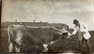 | Harjun tilan härkä ja isäntä Nestori Halonen. Kuva Nestor Halosen kotiarkisto. |